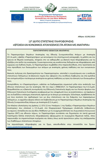 - 30.11.2017 1ο Δελτίο Στατιστικής Πληροφόρησης: «Φτώχεια και κοινωνικός Αποκλεισμός στα Άτομα με Αναπηρία» (Βιβλιοθήκη: Δελτία Στατιστικής Πληροφόρησης)