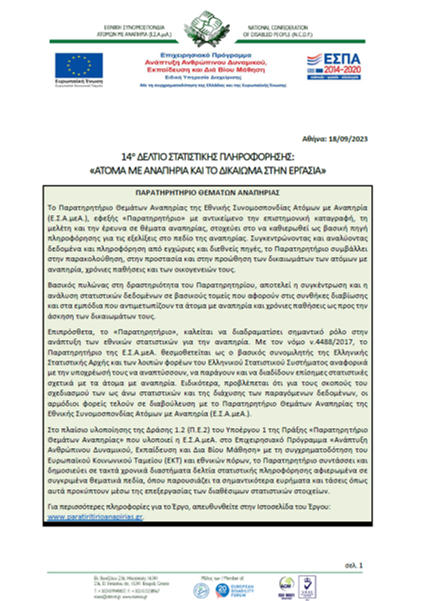 14ο Δελτίο Στατιστικής Πληροφόρησης: «Στοιχεία σοκ για την απασχόληση των ατόμων με αναπηρία: εκτός εργατικού δυναμικού η συντριπτική πλειονότητα!»