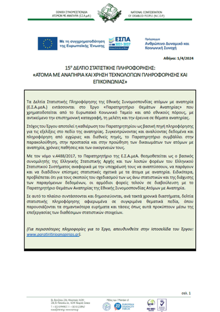 Αντικείμενο του 15ο Δελτίου Στατιστικής Πληροφόρησης (επισυνάπτεται) του Παρατηρητηρίου Θεμάτων Αναπηρίας της ΕΣΑμεΑ αποτελεί η χρήση τεχνολογιών πληροφόρησης και επικοινωνίας (ΤΠΕ) και η επίδραση του παράγοντα της αναπηρίας στην πρόσβαση των ατόμων στα ψηφιακά περιβάλλοντα. Για πρώτη φορά το 2022, έχουμε στη διάθεσή μας τα εν λόγω στοιχεία και για τα άτομα με αναπηρία, καθώς ενσωματώθηκε στο ερωτηματολόγιο της Ετήσιας Έρευνας Χρήσης Τεχνολογιών Πληροφόρησης και Επικοινωνίας από Νοικοκυριά και Άτομα (Information and Communication Technologies - ICT) που υλοποιείται από την Ελληνική Στατιστική Αρχή, μεταβλητή για την αναπηρία.