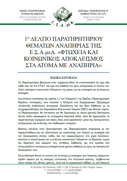 Εγκαινιάζοντας αυτή τη δράση και ενόψει της 3ης Δεκέμβρη-Εθνικής Ημέρας των ατόμων με αναπηρία, το Παρατηρητήριο δημοσιεύει το πρώτο δελτίο τύπου με θέμα «Φτώχεια και κοινωνικός αποκλεισμός στα άτομα με αναπηρία». Το παρόν δελτίο βασίζεται στα στοιχεία της δειγματοληπτικής Έρευνας Εισοδήματος και Συνθηκών Διαβίωσης έτους 2016 (με περίοδο αναφοράς εισοδήματος το 2015), που διενεργείται σε ετήσια βάση από την Ελληνική Στατιστική Αρχή σε συνεργασία με τη Eurostat, και αποτελεί τη βασική πηγή αναφοράς των συγκριτικών στατιστικών για την κατανομή του εισοδήματος και τον κοινωνικό αποκλεισμό στις χώρες της Ε.Ε.