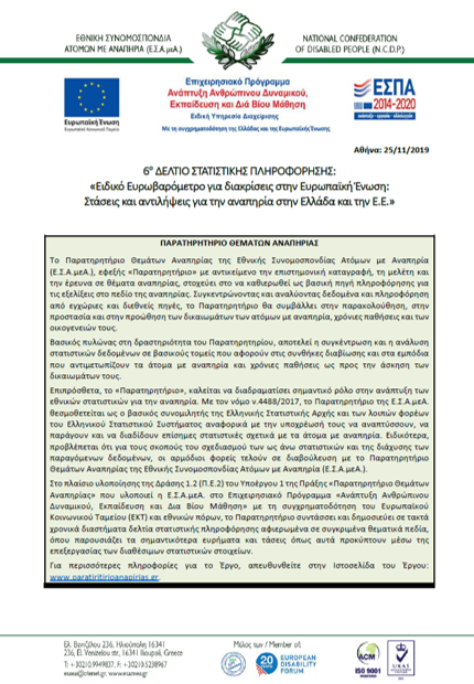 Το Παρατηρητήριο Θεμάτων Αναπηρίας της Εθνικής Συνομοσπονδίας Ατόμων με Αναπηρία (Ε.Σ.Α.μεΑ.), εφεξής «Παρατηρητήριο», με αντικείμενο την επιστημονική καταγραφή, τη μελέτη και την έρευνα σε θέματα αναπηρίας, στοχεύει στο να καθιερωθεί ως βασική πηγή πληροφόρησης για τις εξελίξεις στο πεδίο της αναπηρίας. Συγκεντρώνοντας και αναλύοντας δεδομένα και πληροφόρηση από εγχώριες και διεθνείς πηγές, το Παρατηρητήριο θα συμβάλλει στην παρακολούθηση, στην προστασία και στην προώθηση των δικαιωμάτων των ατόμων με αναπηρία, χρόνιες παθήσεις και των οικογενειών τους.Με αφορμή τη δημοσίευση τον Οκτώβριο του Ειδικού Ευρωβαρόμετρου-έτους 2019 για τις διακρίσεις στην Ευρωπαϊκή Ένωση, αφιερώσαμε το 6ο κατά σειρά δελτίο του Παρατηρητηρίου Θεμάτων Αναπηρίας στις διακρίσεις λόγω αναπηρίας, όπως αυτές αποτυπώνονται στις στάσεις και αντιλήψεις που εξετάζονται στην ειδική έρευνα του Ευρωβαρόμετρου.