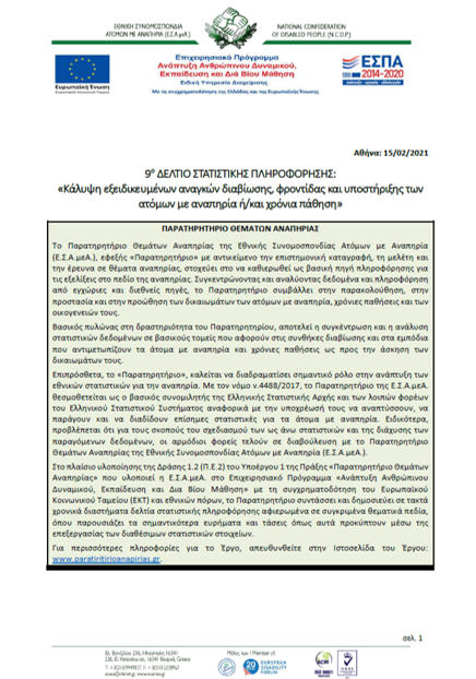 Αντικείμενο του παρόντος δελτίου είναι τα άτομα με αναπηρία ή/και χρόνιες παθήσεις που αντιμετωπίζουν περιορισμούς ως προς την αυτοεξυπηρέτηση τους και συνεπώς έχουν συστηματικές ανάγκες φροντίδας ή/και υποστήριξης στην καθημερινή τους διαβίωση. Το δελτίο επικεντρώνεται κυρίως στη δυνατότητα των νοικοκυριών να ανταπεξέλθουν στις εξειδικευμένες ανάγκες των μελών τους, καθώς και στους τρόπους κάλυψης αυτών των αναγκών φροντίδας και υποστήριξης από τα νοικοκυριά.