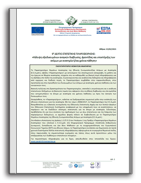 Το Παρατηρητήριο Θεμάτων Αναπηρίας της Εθνικής Συνομοσπονδίας Ατόμων με Αναπηρία (Ε.Σ.Α.μεΑ.), εφεξής «Παρατηρητήριο» με αντικείμενο την επιστημονική καταγραφή, τη μελέτη και την έρευνα σε θέματα αναπηρίας, στοχεύει στο να καθιερωθεί ως βασική πηγή πληροφόρησης για τις εξελίξεις στο πεδίο της αναπηρίας. Συγκεντρώνοντας και αναλύοντας δεδομένα και πληροφόρηση από εγχώριες και διεθνείς πηγές, το Παρατηρητήριο θα συμβάλλει στην παρακολούθηση, στην προστασία και στην προώθηση των δικαιωμάτων των ατόμων με αναπηρία, χρόνιες παθήσεις και των οικογενειών τους. Βασικός πυλώνας στη δραστηριότητα του Παρατηρητηρίου, αποτελεί η συγκέντρωση και η ανάλυση στατιστικών δεδομένων σε βασικούς τομείς που αφορούν στις συνθήκες διαβίωσης και στα εμπόδια που αντιμετωπίζουν τα άτομα με αναπηρία και χρόνιες παθήσεις ως προς την άσκηση των δικαιωμάτων τους.