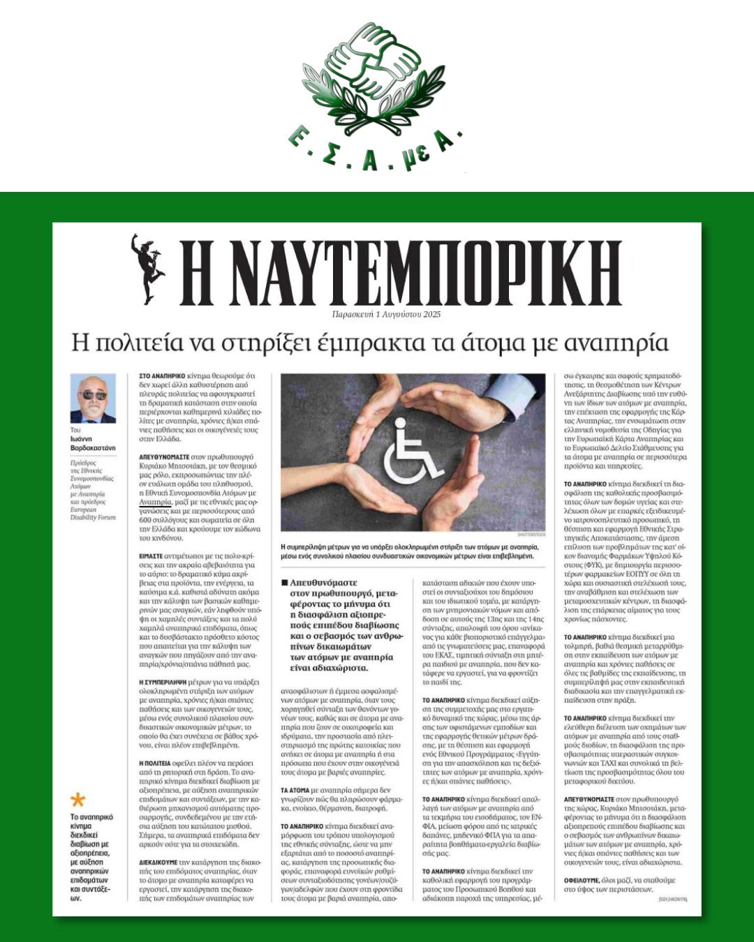 Άρθρο του προέδρου Ε.Σ.Α.μεΑ. Ι. Βαρδακαστάνη στη ΝΑΥΤΕΜΠΟΡΙΚΗ - Δεν υπάρχει άλλος χρόνος: Ήρθε η ώρα η Πολιτεία να στηρίξει έμπρακτα τα άτομα με αναπηρία