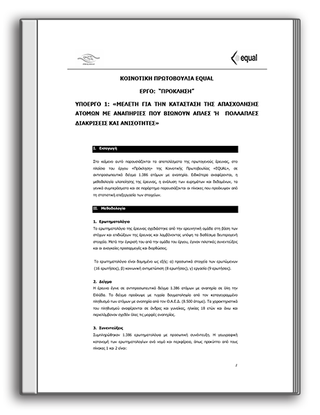 Στο κείμενο αυτό (βλ. συνημμένα αρχείο του παρόντος άρθρου) παρουσιάζονται τα αποτελέσματα της πρωτογενούς έρευνας, στο πλαίσιο του έργου «Πρόκληση» της Κοινοτικής Πρωτοβουλίας «EQUAL», σε αντιπροσωπευτικό δείγμα 1.386 ατόμων με αναπηρία.