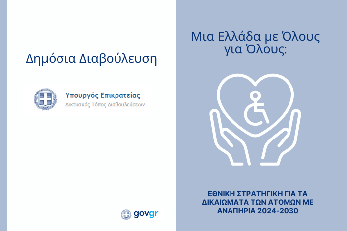 Ξεκίνησε η δημόσια ηλεκτρονική διαβούλευση για την Εθνική Στρατηγική για τα Δικαιώματα των Ατόμων με Αναπηρία 2024-2030 «Μια Ελλάδα με Όλους για Όλους», που θα διαρκέσει μέχρι τις 19 Μαΐου και η ΕΣΑμεΑ καλεί όλες τις οργανώσεις ατόμων με αναπηρία, χρόνιες παθήσεις και των οικογενειών τους, πρωτοβάθμιες και δευτεροβάθμιες, να λάβουν μέρος με τις προτάσεις και τις παρατηρήσεις τους καθώς και κάθε άλλο ενδιαφερόμενο πολίτη.