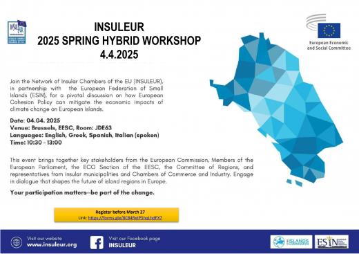 Ο πρόεδρος της ΕΣΑμεΑ Ιωάννης Βαρδακαστάνης, ως πρόεδρος του Τμήματος ECO της ΕΟΚΕ, χαιρέτησε και μίλησε στο υβριδικό εργαστήριο που διοργανώθηκε από το Δίκτυο των Νησιωτικών Εμπορικών και Βιομηχανικών Επιμελητηρίων της ΕΕ (INSULEUR) σε συνεργασία με την ΕΟΚΕ, με τίτλο: «Πώς η ευρωπαϊκή πολιτική συνοχής μπορεί να μετριάσει τις οικονομικές επιπτώσεις της κλιματικής αλλαγής στα ευρωπαϊκά νησιά».