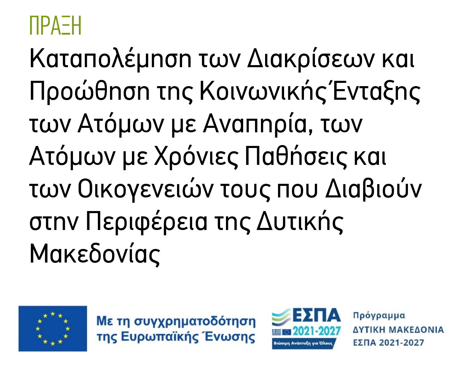 - 12.10.2021 ΠΡΑΞΗ: «Καταπολέμηση των Διακρίσεων και Προώθηση της Κοινωνικής Ένταξης των Ατόμων με Αναπηρία, των Ατόμων με Χρόνιες Παθήσεις και των Οικογενειών τους που Διαβιούν στην Περιφέρεια της Δυτικής Μακεδονίας» (Έργα: Εθνικά)