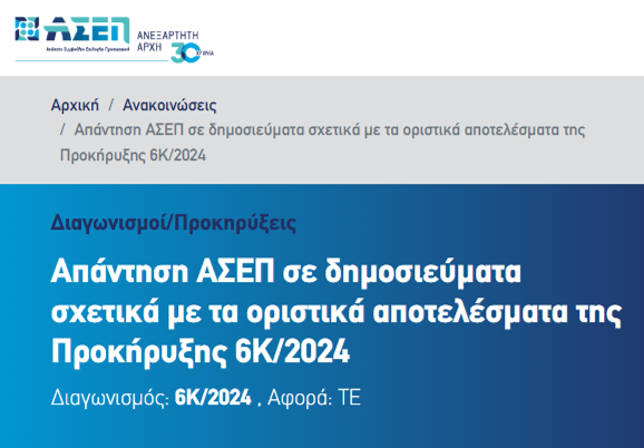 Η ΕΣΑμεΑ διευκρινίζει σε σχέση με την ανακοίνωση του ΑΣΕΠ περί Απάντηση ΑΣΕΠ σε δημοσιεύματα σχετικά με τα οριστικά αποτελέσματα της Προκήρυξης 6Κ/2024.