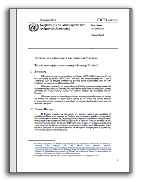 Τελικές Παρατηρήσεις και Συστάσεις στην αρχική έκθεση της Ελλάδας από την Επιτροπή των ΗΕ για τα Δικαιώματα των Ατόμων με Αναπηρίες (2019)