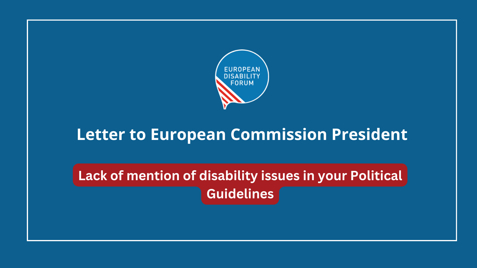 Σας γράφω εξ ονόματος του Ευρωπαϊκού Φόρουμ για την Αναπηρία (EDF) για να εκφράσουμε την διαμαρτυρία μας για την έλλειψη αναφοράς στα άτομα με αναπηρία, στα ζητήματα προσβασιμότητας και στα θέματα που σχετίζονται με τα δικαιώματα των ατόμων με αναπηρία, στο έγγραφο που δημοσιεύθηκε στις 18 Ιουλίου 2024 και περιγράφει τις πολιτικές σας προτεραιότητες «Η επιλογή της Ευρώπης - Πολιτικές κατευθυντήριες γραμμές για την επόμενη Ευρωπαϊκή Επιτροπή 2024−2029».
