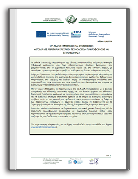 Αντικείμενο του 15ο Δελτίου Στατιστικής Πληροφόρησης (επισυνάπτεται) του Παρατηρητηρίου Θεμάτων Αναπηρίας της ΕΣΑμεΑ αποτελεί η χρήση τεχνολογιών πληροφόρησης και επικοινωνίας (ΤΠΕ) και η επίδραση του παράγοντα της αναπηρίας στην πρόσβαση των ατόμων στα ψηφιακά περιβάλλοντα. Για πρώτη φορά το 2022, έχουμε στη διάθεσή μας τα εν λόγω στοιχεία και για τα άτομα με αναπηρία, καθώς ενσωματώθηκε στο ερωτηματολόγιο της Ετήσιας Έρευνας Χρήσης Τεχνολογιών Πληροφόρησης και Επικοινωνίας από Νοικοκυριά και Άτομα (Information and Communication Technologies - ICT) που υλοποιείται από την Ελληνική Στατιστική Αρχή, μεταβλητή για την αναπηρία.