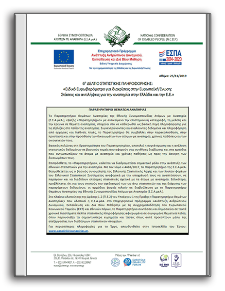 Το Παρατηρητήριο Θεμάτων Αναπηρίας της Εθνικής Συνομοσπονδίας Ατόμων με Αναπηρία (Ε.Σ.Α.μεΑ.), εφεξής «Παρατηρητήριο», με αντικείμενο την επιστημονική καταγραφή, τη μελέτη και την έρευνα σε θέματα αναπηρίας, στοχεύει στο να καθιερωθεί ως βασική πηγή πληροφόρησης για τις εξελίξεις στο πεδίο της αναπηρίας. Συγκεντρώνοντας και αναλύοντας δεδομένα και πληροφόρηση από εγχώριες και διεθνείς πηγές, το Παρατηρητήριο θα συμβάλλει στην παρακολούθηση, στην προστασία και στην προώθηση των δικαιωμάτων των ατόμων με αναπηρία, χρόνιες παθήσεις και των οικογενειών τους.Με αφορμή τη δημοσίευση τον Οκτώβριο του Ειδικού Ευρωβαρόμετρου-έτους 2019 για τις διακρίσεις στην Ευρωπαϊκή Ένωση, αφιερώσαμε το 6ο κατά σειρά δελτίο του Παρατηρητηρίου Θεμάτων Αναπηρίας στις διακρίσεις λόγω αναπηρίας, όπως αυτές αποτυπώνονται στις στάσεις και αντιλήψεις που εξετάζονται στην ειδική έρευνα του Ευρωβαρόμετρου.