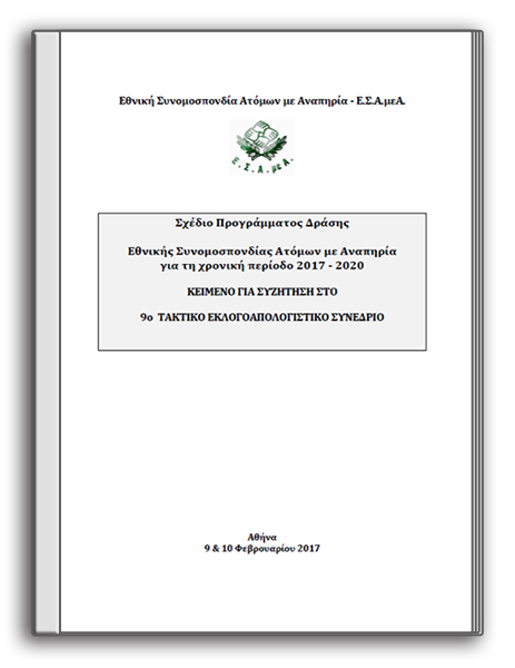 Μπροστά στο 9ο Εκλογοαπολογιστικό Συνέδριο της Ε.Σ.Α.μεΑ., που θα διεξαχθεί στις 9 και 10 Φεβρουαρίου 2017 στην Αθήνα, στο ξενοδοχείο Τιτάνια, δημοσιεύονται ο Απολογισμός και το Σχέδιο Προγράμματος Δράσης της Ε.Σ.Α.μεΑ. 2017-2020.