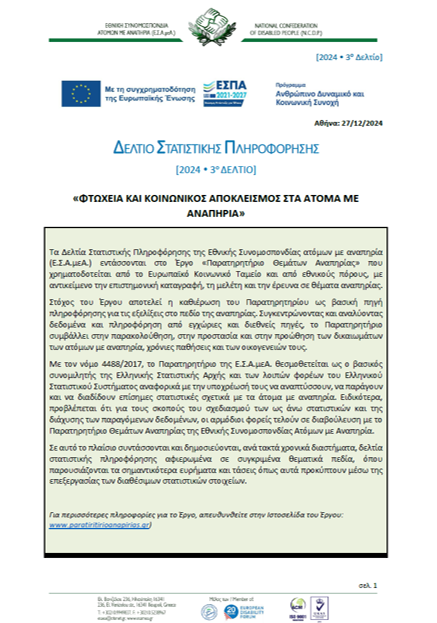 Αντικείμενο του 3ου Δελτίου Στατιστικής Πληροφόρησης του Παρατηρητηρίου Θεμάτων Αναπηρίας της ΕΣΑμεΑ για το 2024 είναι η Φτώχεια και ο Κοινωνικός Αποκλεισμός στα άτομα με αναπηρία, χρόνιες ή/και σπάνιες παθήσεις. Τα άτομα με αναπηρία, χρόνιες ή/και σπάνιες παθήσεις αποτελούν μια πληθυσμιακή ομάδα που βιώνει με τον πλέον σκληρό τρόπο, τις επιπτώσεις μιας παρατεταμένης και πολύπλευρης κρίσης. Στο σημερινό δυσχερές για την κοινωνία πλαίσιο, πέραν τις οικονομικής κρίσης έχουν προστεθεί υγειονομικές, κλιματικές και ενεργειακές απειλές, που επιδρούν επίσης υπέρμετρα στο βιοτικό επίπεδο των ατόμων με αναπηρία, χρόνιες ή/και σπάνιες παθήσεις.