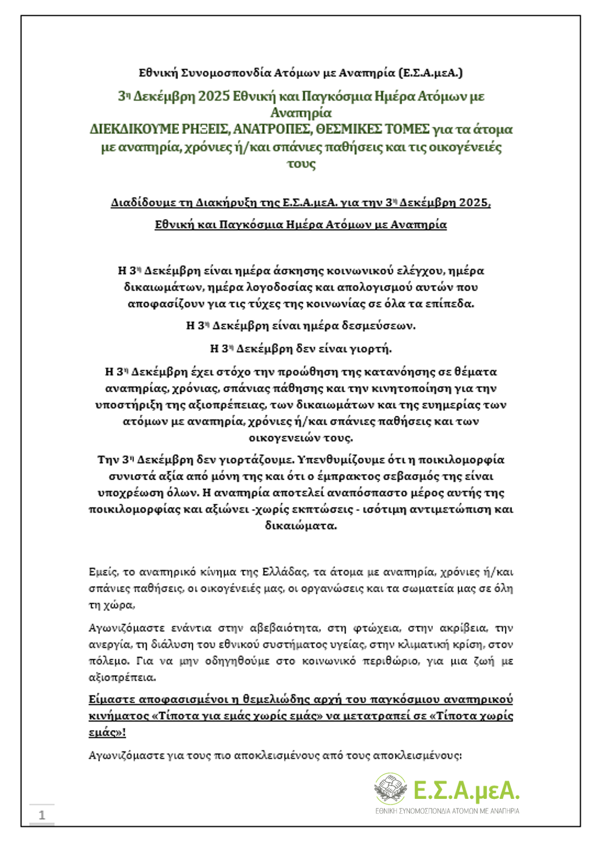 Διακήρυξη της Ε.Σ.Α.μεΑ. για την 3η Δεκέμβρη 2025: ΔΙΕΚΔΙΚΟΥΜΕ ΡΗΞΕΙΣ, ΑΝΑΤΡΟΠΕΣ, ΘΕΣΜΙΚΕΣ ΤΟΜΕΣ για τα άτομα με αναπηρία, χρόνιες ή/και σπάνιες παθήσεις και τις οικογένειές τους