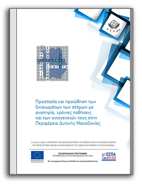 Η παρούσα έκδοση υλοποιήθηκε στο πλαίσιο της Πράξης «Καταπολέμηση των διακρίσεων και προώθηση της κοινωνικής ένταξης των ατόμων με αναπηρία, των ατόμων με χρόνιες παθήσεις και των οικογενειών τους που διαβιούν στην Περιφέρεια Δυτικής Μακεδονίας» που εντάσσεται στο Επιχειρησιακό Πρόγραμμα «Δυτική Μακεδονία 2014-2020». Η Πράξη συγχρηματοδοτείται από την Ευρωπαϊκή Ένωση (Ευρωπαϊκό Κοινωνικό Ταμείο) και από εθνικούς πόρους με δικαιούχο και φορέα υλοποίησης την Εθνική Συνομοσπονδία Ατόμων με Αναπηρία (Ε.Σ.Α.μεΑ.).