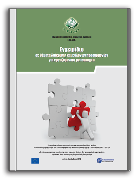 Το «Εγχειρίδιο σε θέματα διάκρισης και εύλογων προσαρμογών για εργαζόμενους με αναπηρία» εκπονήθηκε από την Εθνική Συνομοσπονδία Ατόμων με Αναπηρία (Ε.Σ.Α.μεΑ.) στο πλαίσιο της Υπο-δράσης «Εκπαίδευση των Στελεχών του Σώματος Επιθεωρητών Εργασίας (Σ.ΕΠ.Ε.) σε θέματα διάκρισης και εύλογων προσαρμογών για εργαζόμενους με αναπηρία» της Δράσης «Καταπολέμηση των Διακρίσεων στην Αγορά Εργασίας».
