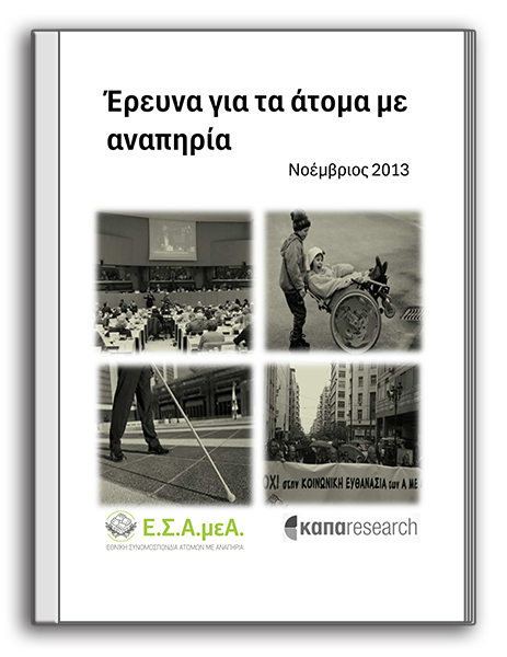 Η ΚΑΠΑ RESEARCH Α.Ε., μεταξύ 31 Οκτωβρίου και 21 Νοεμβρίου 2013, διεξήγαγε πανελλαδική έρευνα κοινής γνώμης για τα άτομα με αναπηρία, για λογαριασμό της ΕΣΑμεΑ. Η συλλογή των στοιχείων έγινε με την μέθοδο των τηλεφωνικών συνεντεύξεων και βάσει ηλεκτρονικού ερωτηματολογίου. Στην έρευνα συμμετείχαν 4.506 άτομα, πανελλαδικά, με αναλογική κατανομή στις 13 περιφέρειες της χώρας.