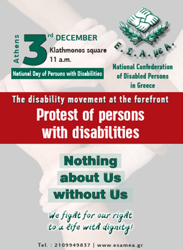Το αναπηρικό κίνημα διατρανώνει το σύνθημά του "Τίποτα για Εμάς χωρίς Εμάς" και αγωνίζεται για τη λήψη συντονισμένων μέτρων και στοχευμένων πολιτικών, με στόχο την προστασία των ατόμων με αναπηρία, χρόνιες παθήσεις και των οικογενειών τους, δεδομένου ότι είναι κοινή παραδοχή ότι τα άτομα με αναπηρία και χρόνιες παθήσεις και οι οικογένειές τους συγκροτούν μία από τις ομάδες του πληθυσμού που έχουν πληγεί ιδιαίτερα από τα μέτρα λιτότητας και την κρίση, σε όλους τους τομείς της ζωής τους.