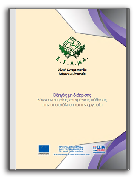 Ο παρών «Οδηγός μη διάκρισης λόγω αναπηρίας και χρόνιας πάθησης στην απασχόληση και την εργασία» εκπονήθηκε από την Εθνική Συνομοσπονδία Ατόμων με Αναπηρία (Ε.Σ.Α.μεΑ.) στο πλαίσιο υλοποίησης του Υποέργου 4 (Π.Ε.4, Π4.2) της Πράξης «Προωθώντας την κοινωνική ένταξη των ατόμων με αναπηρία, χρονιές παθήσεις και των οικογενειών τους που διαβιούν στην Περιφέρεια Δυτικής Ελλάδας». Η Πράξη, με δικαιούχο την Ε.Σ.Α.μεΑ., εντάσσεται στο Επιχειρησιακό Πρόγραμμα «Δυτική Ελλάδα 2014-2020» και συγχρηματοδοτείται από το Ευρωπαϊκό Κοινωνικό Ταμείο (ΕΚΤ) και από Εθνικούς Πόρους.