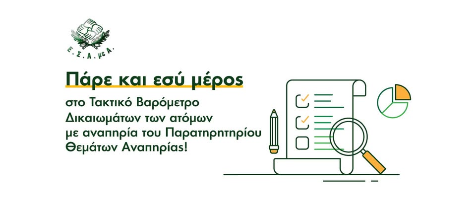 Για να συμμετέχετε στην έρευνα «Τακτικό Βαρόμετρο Δικαιωμάτων των Ατόμων με Αναπηρία του Παρατηρητηρίου Θεμάτων Αναπηρίας» μεταβείτε στους αντίστοιχους συνδέσμους.