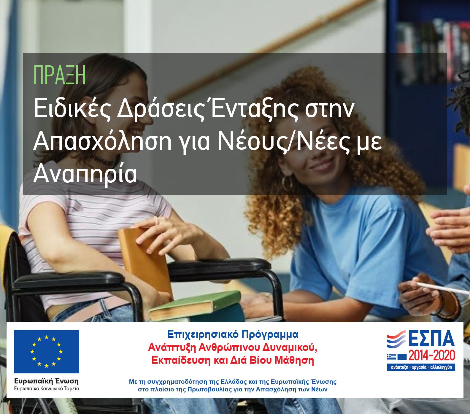Στο πλαίσιο του Ε.Π. «Ανάπτυξη Ανθρώπινου Δυναμικού, Εκπαίδευση & Δια Βίου Μάθηση» ΕΣΠΑ 2014 – 2020 εντάχθηκε η Πράξη «Ειδικές Δράσεις Ένταξης στην Απασχόληση για Νέους/Νέες με Αναπηρία» με κωδικό ΟΠΣ (MIS) 5073491 στον Άξονα Προτεραιότητας: 3 «Διευκόλυνση της πρόσβασης στην απασχόληση των νέων έως 29 ετών», στον Θεματικό Στόχο: 08 «Προώθηση της διατηρήσιμης και ποιοτικής απασχόλησης και στήριξη της κινητικότητας του εργατικού δυναμικού», στην Επενδυτική Προτεραιότητα: 8iiY «Βιώσιμη ένταξη στην αγορά εργασίας των νέων (ΠΑΝ), ιδιαίτερα εκείνων που βρίσκονται εκτός απασχόλησης, εκπαίδευσης ή κατάρτισης, συμπεριλαμβανομένων των νέων που αντιμετωπίζουν τον κίνδυνο κοινωνικού αποκλεισμού και των νέων από περιθωριοποιημένες κοινότητες, μεταξύ άλλων μέσω της υλοποίησης της «Εγγύησης για τη νεολαία» και στον Ειδικό Στόχο: Αύξηση της απασχόλησης συμπεριλαμβανομένης της αυτοαποσχόλησης και βελτίωση των δεξιοτήτων των νέων εκτός εργασίας, εκπαίδευσης ή κατάρτισης ηλικίας 15 έως 29 ετών.